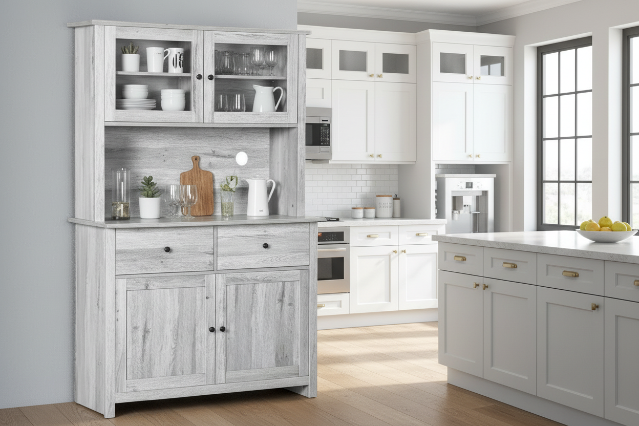 Un buffet avec plusieurs niveaux de rangement, des tiroirs et un plan de travail ouvert — gardant casseroles, poêles et baguettes bien organisés. Gardez le désordre hors de portée et la beauté sur le plan de travail.